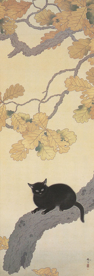 この《黒き猫》は、西洋画から得た写実と、日本美術の装飾性を融合させた晩年の代表作です。柏の葉の輝きを裏色彩(絵絹の裏にも顔料を塗る技法)で表現しています。